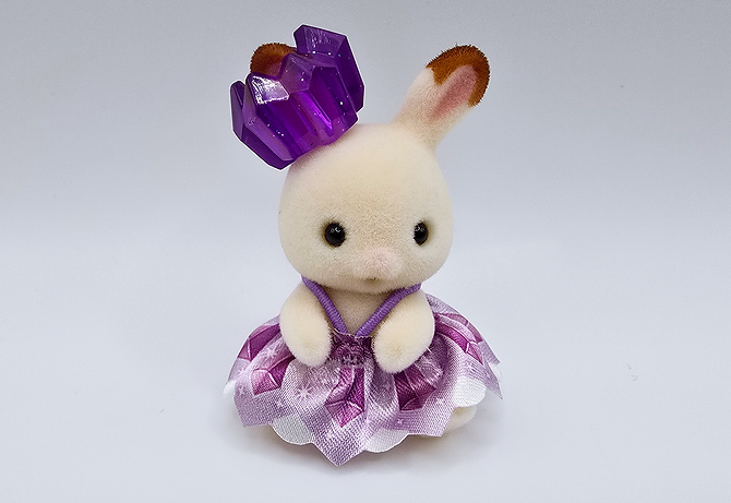 From the Fairy Forest Friends blind bag series. Chocolate Rabbit baby wearing a flower crystal outfit.